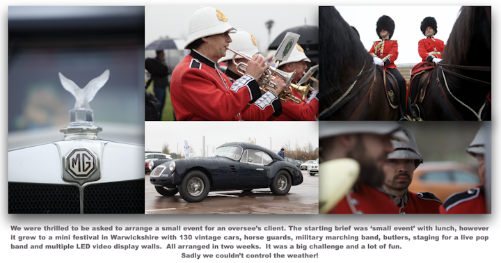 We were thrilled to be asked to arrange a small event for an oversee’s client. The starting brief was ‘small event’ with lunch, however it grew to a mini festival in Warwickshire with 130 vintage cars, horse guards, military marching band, butlers, staging for a live pop band and multiple LED video display walls. All arranged in two weeks. It was a big challenge and a lot of fun.
