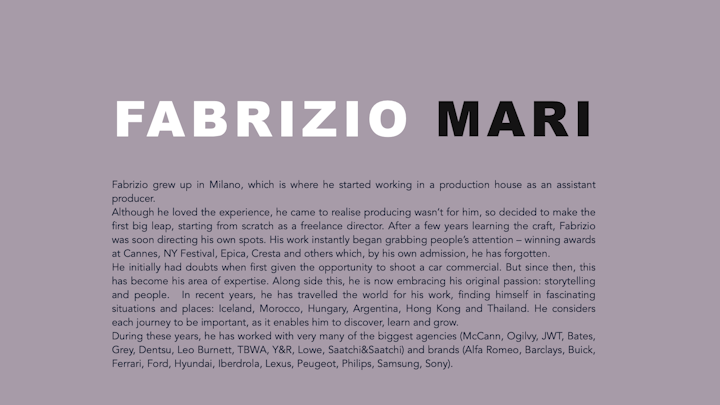 Although he loved the experience, he came to realise producing wasn’t for him, so decided to make the first big leap, starting from scratch as a freelance director. After a few years learning the craft, Fabrizio was soon directing his own spots. His work instantly began grabbing people’s attention – winning awards at Cannes, NY Festival, Epica, Cresta and others which, by his own admission, he has forgotten.